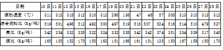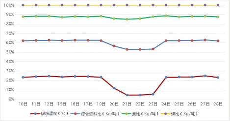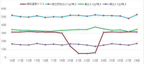 23日炉况运行平稳,无塌料,风量1350 m³/min, 风温1170℃,透气性指数14.5左右,富氧量1500m³/h,富氧率1.45%,矿批14400kg,湿焦负荷4.00/吨 ,料速均匀稳定在7/h,小时喷煤量8000±300kg/h,煤比137kg/吨铁,综合燃料比控制在517 kg/吨铁。较停喷煤预热器前煤比减少22kg/吨铁,综合燃料比上升17kg/吨铁。