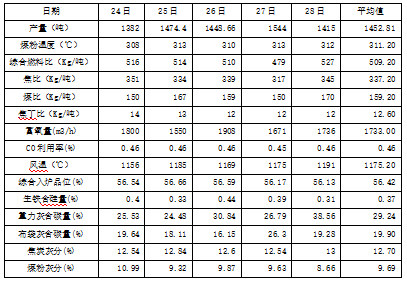 1月24日—28日喷煤预热器投入使用后高炉各项操作参数及经济技术指标如下: